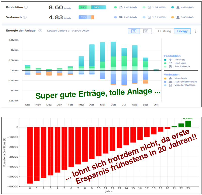 Man sagt ja, ein finanziertes Haus bezahlt man zweimal ab - das ist bei einer Mietkauf-Anlage nicht anders, nur hübscher verpackt. Denn im Energie-Monitoring sieht der Kunde bewusst nur, wie toll die Anlage täglich produziert und kWh erwirtschaftet, nicht aber den ernüchternden Stand im Cashflow.